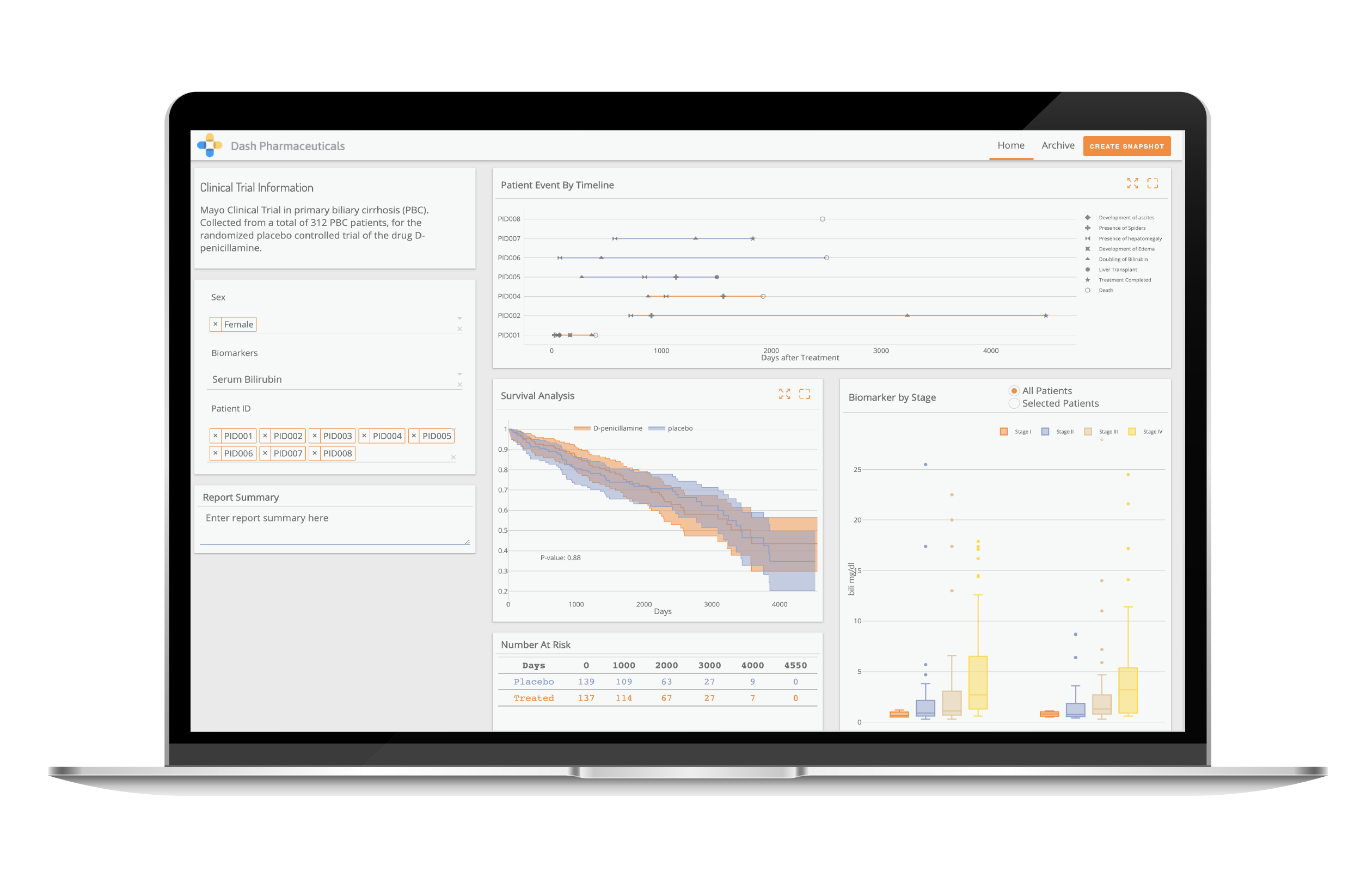 This app visualizes a Mayo clinical trial in primary biliary cirrhosis (PBC). Collected from a total of 312 PBC patients, for the randomized placebo controlled trial of the drug D-penicillamine.